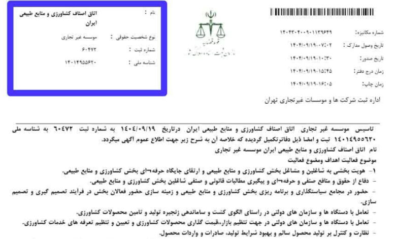 در اقدامی مهم و ساختاری، اتاق اصناف کشاورزی و منابع طبیعی ایران بهطور رسمی در سازمان ثبت اسناد و املاک کشور به ثبت رسید. این رویداد که همزمان با زادروز مبارک حضرت فاطمه زهرا(س) و روز مادر انجام شد، از سوی فعالان بخش کشاورزی بهعنوان گامی مؤثر در جهت انسجام صنفی، تقویت جایگاه تولیدکنندگان و ارتقای حکمرانی بخش کشاورزی ارزیابی میشود.